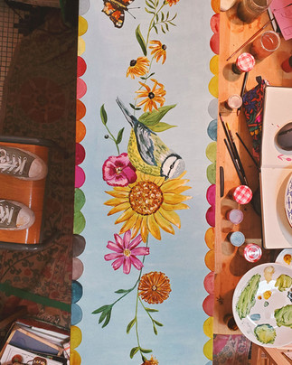 Je me suis inspirée des fresques paysannes peintes sur les meubles et, toujours fidèle à ma thématique des plantes tinctoriales, j’ai créé un motif. Cosmos, calendula, pensée, rudbeckia, tournesol… Des plantes qui sont ou belles, ou colorantes, et qui accueillent la biodiversité : papillons, bourdons et mésanges.